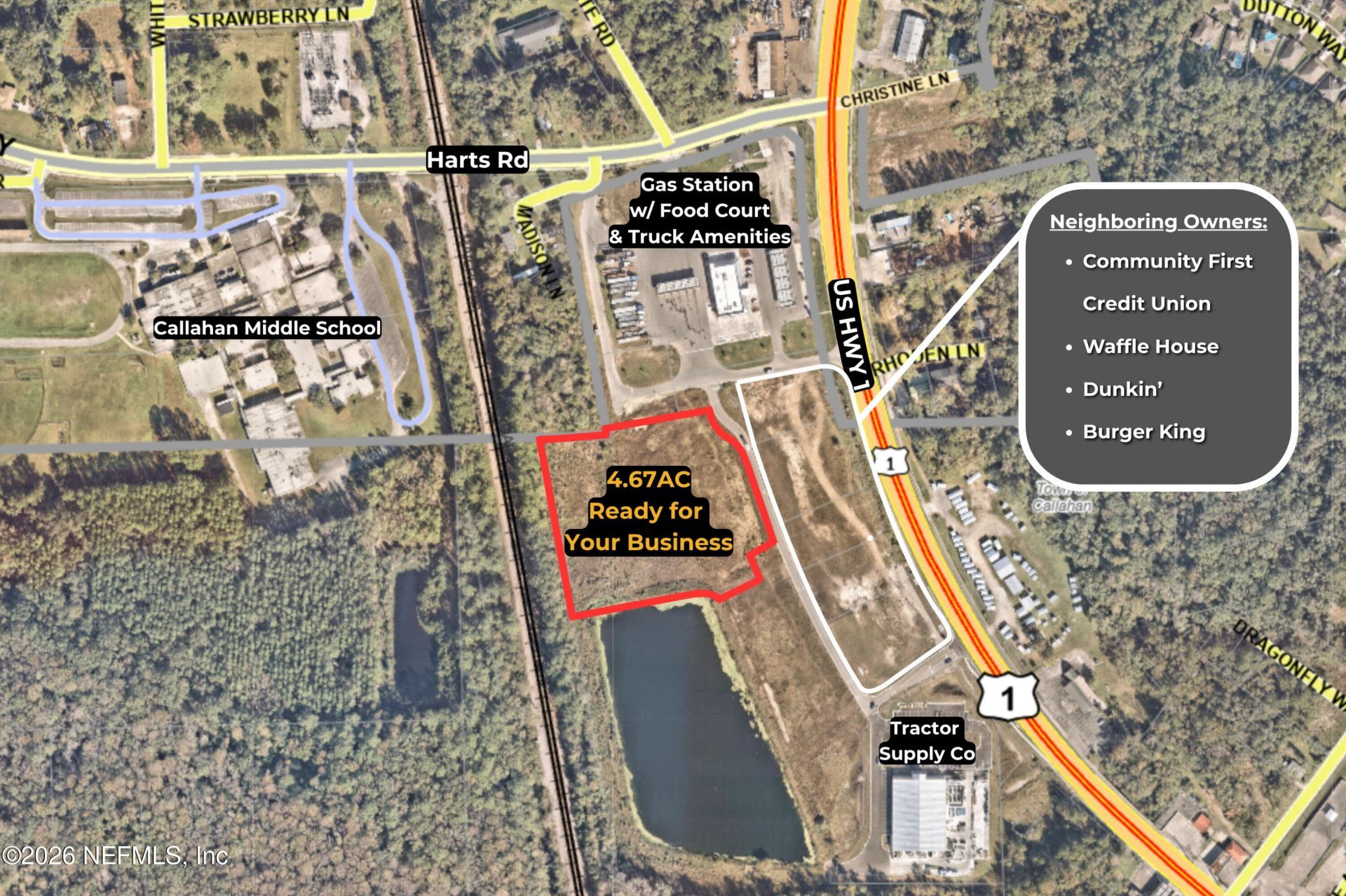 Bring your business plan! This 4.67-acre Commercial Intensive site on US Highway 1 in Callahan, Florida is ready for development. With visibility on a major thoroughfare, utilities run to the site and ready for hookup, and initial grading already completed, this property eliminates the early hurdles that slow most commercial projects down. Commercial Intensive (CI) zoning permits an exceptionally broad range of uses without conditional use approval. Permitted uses include auto, truck, boat, and ...Bring your business plan! This 4.67-acre Commercial Intensive site on US Highway 1 in Callahan, Florida is ready for development. With visibility on a major thoroughfare, utilities run to the site and ready for hookup, and initial grading already completed, this property eliminates the early hurdles that slow most commercial projects down. Commercial Intensive (CI) zoning permits an exceptionally broad range of uses without conditional use approval. Permitted uses include auto, truck, boat, and equipment dealerships, gas stations and truck stops, repair garages and body shops, car washes, restaurants and drive-ins, hotels and motels, retail centers and shopping centers, lumber yards and building supply stores, self-storage facilities, medical and professional offices, veterinary clinics, funeral homes, commercial parking, plant nurseries, and establishments serving alcoholic beverages. Conditional uses expand the possibilities even further to include wholesale warehousing and distribut ion, light manufacturing and food processing, and building contractors with outdoor storage and heavy equipment. Located at the Harts Rd and US Highway 1 corridor in Callahan, FL 32011, this site is surrounded by established national and regional brands including Dunkin', Burger King, Waffle House, Tractor Supply Co, and Community First Credit Union, and is adjacent to a gas station with food court and truck amenities. The proven commercial demand at this high-traffic intersection make this lot the perfect place for your business. Schedule your site visit today!