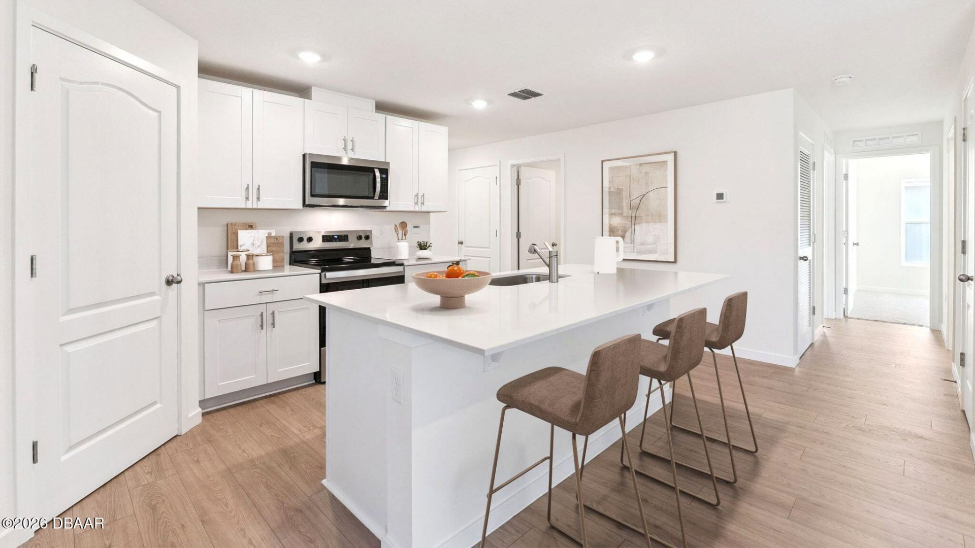The Dundee is a versatile single-story floor plan designed to fit the needs of today's families. With 5 bedrooms, 2 bathrooms, and an open layout, this home offers both flexibility and comfort in every corner. The connected kitchen, dining, and living areas create a central hub that's perfect for entertaining guests or enjoying everyday moments together.The primary suite is situated at the back of the home for added privacy, featuring a walk-in closet and a well-appointed bathroom with dual sink...The Dundee is a versatile single-story floor plan designed to fit the needs of today's families. With 5 bedrooms, 2 bathrooms, and an open layout, this home offers both flexibility and comfort in every corner. The connected kitchen, dining, and living areas create a central hub that's perfect for entertaining guests or enjoying everyday moments together.The primary suite is situated at the back of the home for added privacy, featuring a walk-in closet and a well-appointed bathroom with dual sinks. Four additional bedrooms are located toward the front, providing ample space for family, guests, or even a dedicated home office or hobby room.The kitchen stands out with its modern finishes, including an island, quartz countertops, and stainless-steel appliances, all designed to make cooking and gathering effortless. Every Dundee also comes equipped with a smart home package, keeping your home secure whether you're there or on the go. Contact us today. *Photos are of similar model but not that of exact house. Pictures, photographs, colors, features, and sizes are for illustration purposes only and will vary from the homes as built. Home and community information including pricing, included features, terms, availability and amenities are subject to change and prior sale at any time without notice or obligation. Please note that no representations or warranties are made regarding school districts or school assignments; you should conduct your own investigation regarding current and future schools and school boundaries.*
