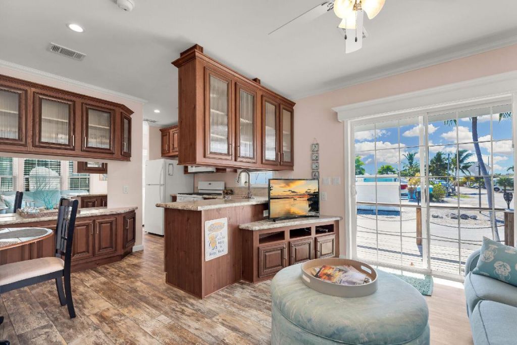 Coastal-inspired and spotlessly clean 1BR/1BA mobile home on a desirable corner lot in a gated 55+ community. Features an oversized porch perfect for relaxing and entertaining. Optional marina access is available for an additional fee. THIS IS A LAND LEASE COMMUNITY AND NO REAL ESTATE CONVEYS