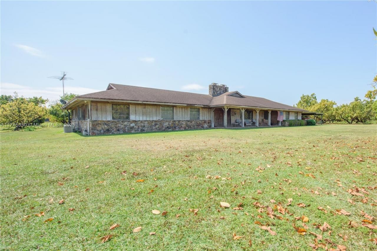 Private farmhouse oasis sitting on 3 Folios = 17+ ac income-producing avocado grove in Redland, FL near fruit & spice park! This custom CBS home, covered in cedar, features a guest/house & offers privacy, & resort-style living. Includes formal living/dining space, spacious kitchen, two fireplaces, & master suite. Four sliding doors open to an 1,860 sq ft screened pool w/ waterfall, sun shelf, & 61x13 patio with bar/grill?great for hosting 100+ guests! Wide porches, 1,335 sq ft carport, & 4,000 sq ft, 20-ft-high tool shed with 1,000 sq ft overhang?ideal for equipment& toys. Property is fully fenced with security cameras onsite. Diesel irrigation & tropical fruit trees: lychee, papaya, banana, carambola, & aloe. Built beyond Miami-Dade code. Zoned to build 2 more homes.