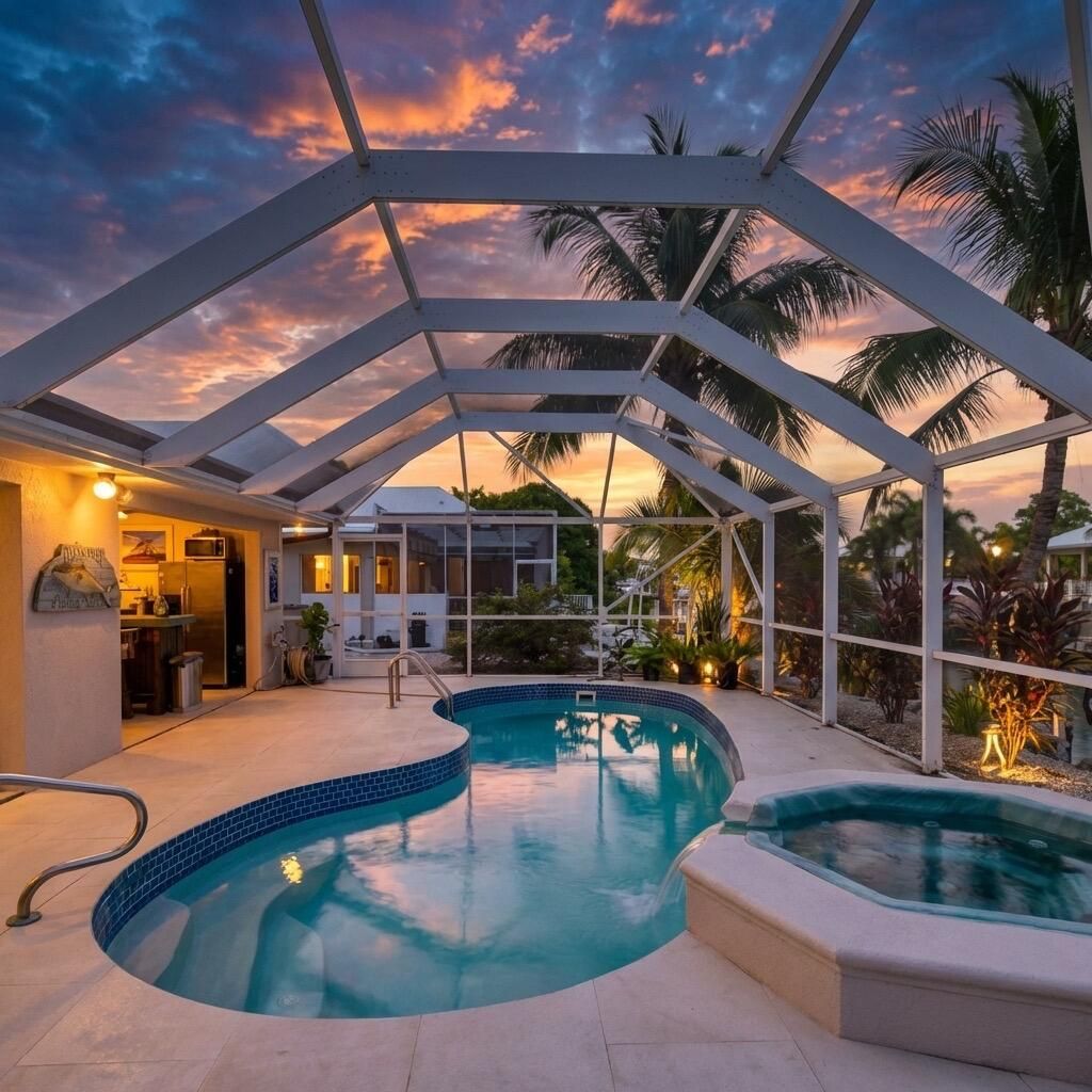 FISHERMAN'S DREAM! BIG BOATS WELCOME! DEEP WATER! LARGE WATERFRONT HOME in the prestigious neighborhood of Cudjoe Gardens. When you first walk up you will notice the beautiful landscaping, tropical fruit trees, key limes, mangoes, lemons, bananas and avocados! This stunning and elegant concrete residence on elevated lot, offers the perfect harmony of luxury and comfort. All new impact windows & doors, framed by custom plantation shutters. Every space has been meticulously curated, brand-new AC, ...FISHERMAN'S DREAM! BIG BOATS WELCOME! DEEP WATER! LARGE WATERFRONT HOME in the prestigious neighborhood of Cudjoe Gardens. When you first walk up you will notice the beautiful landscaping, tropical fruit trees, key limes, mangoes, lemons, bananas and avocados! This stunning and elegant concrete residence on elevated lot, offers the perfect harmony of luxury and comfort. All new impact windows & doors, framed by custom plantation shutters. Every space has been meticulously curated, brand-new AC, and more! This incredible property with almost 3,000sf offers an open and spacious floor plan. The living area blends seamlessly with the screened in lanai with full bar, concrete heated, saltwater pool and overflow hot tub, offering full sun during the day. Leave the full wall of glass doors open to allow the fresh breeze of the Florida Keys as well as the gentle sound of the pool's waterfall. The Custom Chef's Kitchen has top of the line Stainless Steel Appliances, new wine cooler, Granite Countertops, huge island, and Custom Cabinetry. The home has a large master bedroom suite with its own living room/office/exercise area, sliders to back yard, 2 closets, and wonderful bathroom with spa like shower. 2 large guest bedrooms with full bath, an incredible Mother In Law/Guest Suite set up as bedroom sleeping 4-8 people with living area, with it's own driveway and private entrance and access to lanai, gorgeous bamboo flooring with inlayed Compass Rose and ceiling made of river recovered heart cypress, walk in closet designed as storm shelter, and full bath. Other features, outdoor kitchen and bar, 1 car garage with ample storage, double boat lift 20,000lb, 5 ft draft, 2 Ace 5,500lb davits, 100x10 concrete dock, Killer Dock brand fish cleaning station, commercial ice maker, and 5 min. Ride from the Ocean or Gulf, Fuel, Marina, and Tackle store, perfect for the avid fisherman. Wide canal, flow thru canal. This property is a boat lover, fisherman, and chef's Dream Home
