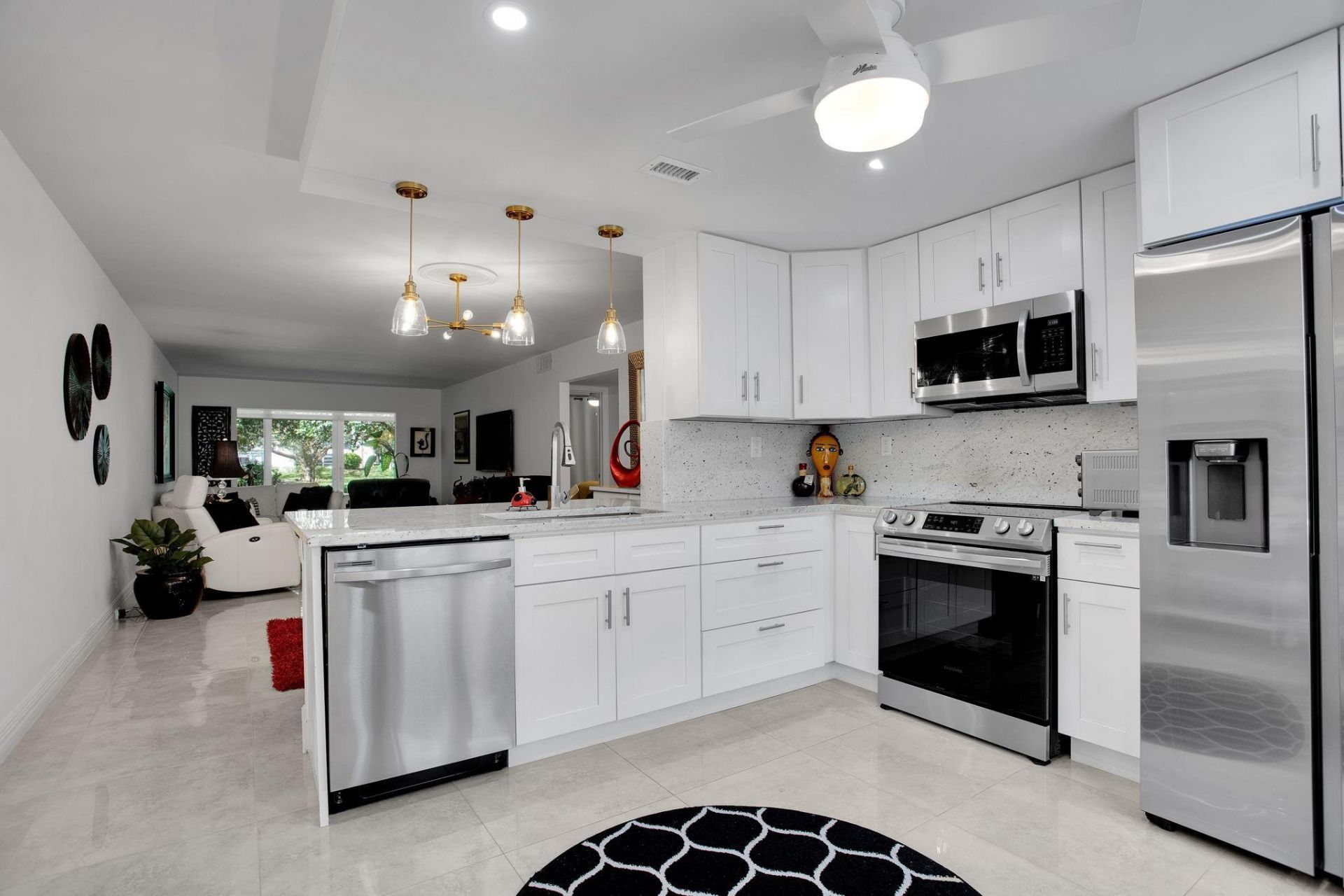 OPENHOUSE THIS SUNDAY MARCH 15, 2026, FROM 2:00-4:00 panoramic sliding doors that lead to a private patio equipped with motorized window treatments. Enjoy beautifully landscaped garden, located steps away from the village pool. Features porcelain flooring throughout. Stylish open kitchen, white shaker cabinets, quartz countertops, stainless steel appliances, slide-in glass-top stove, a counter-depth refrigerator. The dining room includes additional storage with a built-in buffet. Both bathroo...OPENHOUSE THIS SUNDAY MARCH 15, 2026, FROM 2:00-4:00 panoramic sliding doors that lead to a private patio equipped with motorized window treatments. Enjoy beautifully landscaped garden, located steps away from the village pool. Features porcelain flooring throughout. Stylish open kitchen, white shaker cabinets, quartz countertops, stainless steel appliances, slide-in glass-top stove, a counter-depth refrigerator. The dining room includes additional storage with a built-in buffet. Both bathrooms have been renovated, floor-to-ceiling glass shower doors and modern vanities with single sinks, maximizing space for toiletries. all smooth ceilings, free of popcorn texture, new interior bedroom doors, and a barn door that connects the bedroom to the patio. Discover your ideal ground-floor condo featuring high-impact hurricane windows, a patio with motorized window treatments, and porcelain flooring throughout. The open kitchen boasts stylish white shaker cabinets, quartz countertops, stainless-steel appliances, a slide-in glass-top stove, and a counter-depth refrigerator. Host friends and family with the built-in buffet in the dining room, and enjoy your private patio overlooking a landscaped garden, just steps from the village pool. Both bathrooms have been elegantly renovated with floor-to-ceiling glass shower doors and modern vanities with a single sink to maximize space for toiletries. The design includes smooth ceilings (no popcorn), along with new interior bedroom doors and a barn door from the bedroom to the patio