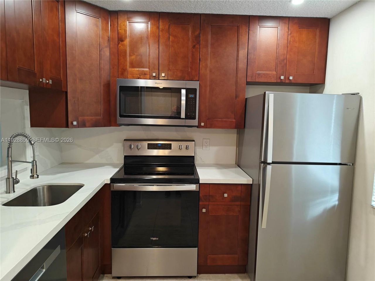This beautifully renovated apartment showcases new dark wood kitchen cabinetry paired with white quartz countertops and a matching backsplash, complemented by stainless steel appliances including a refrigerator, flat-top range, dishwasher, and microwave. A new water heater and in-unit washer and dryer provide modern convenience. Additional upgrades include new shelving and blinds, along with contemporary ceiling fans with remote controls in both the living room and bedroom. Popcorn ceilings have...This beautifully renovated apartment showcases new dark wood kitchen cabinetry paired with white quartz countertops and a matching backsplash, complemented by stainless steel appliances including a refrigerator, flat-top range, dishwasher, and microwave. A new water heater and in-unit washer and dryer provide modern convenience. Additional upgrades include new shelving and blinds, along with contemporary ceiling fans with remote controls in both the living room and bedroom. Popcorn ceilings have been removed, and the entire unit has been freshly painted, creating a clean, modern feel. Enjoy tranquil pool views from the screened balcony. Convenient assigned parking close to the unit is included for added convenience. The quiet, well-kept community features a large pool and a recently renovated, fully equipped fitness center with new machines. The property is professionally maintained with a service contract covering all systems and appliances. Excellent landlord. Fast association approval.